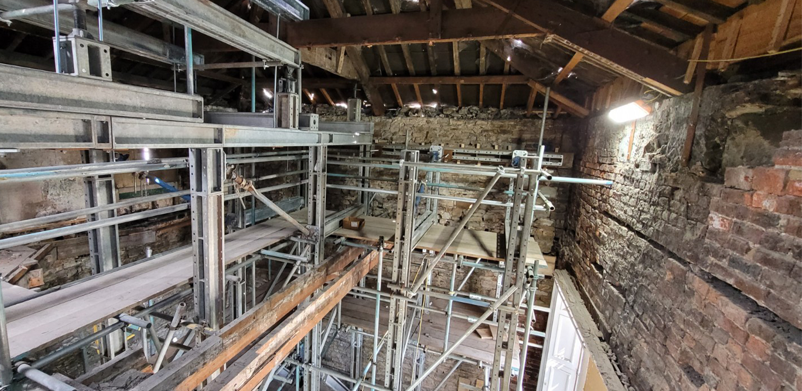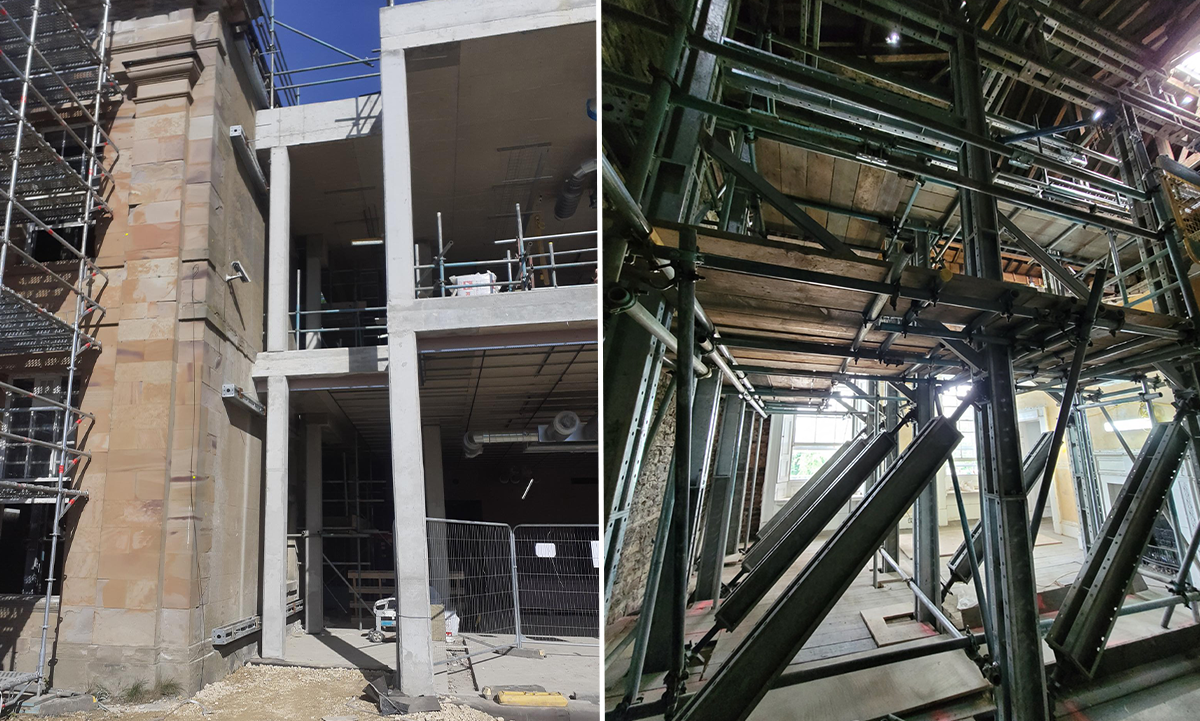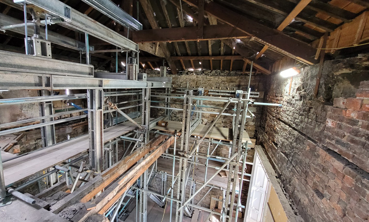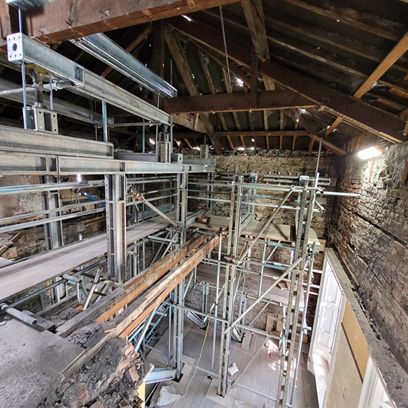 The limited working space within and around the manor house increased the complexity of installation, requiring an efficient temporary works solution that ensured safety without obstructing ongoing construction.