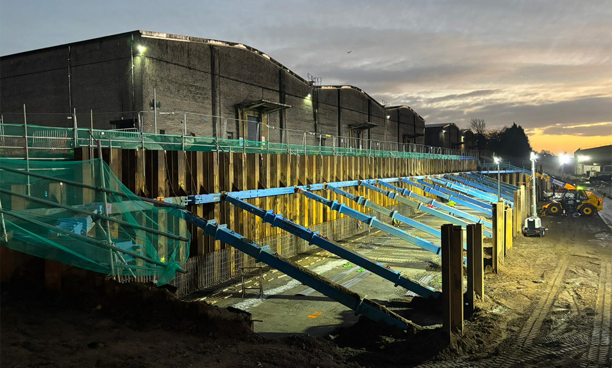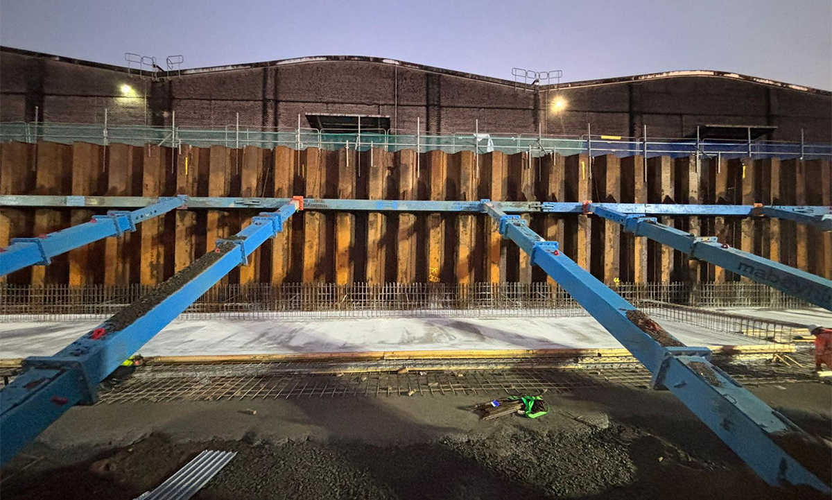 Mabey Hire delivered a tailored temporary works solution by installing 10m sheet piles supported by raking and knee-brace props, using Larsen piles and modular frame extensions as sustainable thrust restraints. The propping system was carefully designed to avoid clashes with permanent works and to provide lower-level support, developed in close coordination with consultants Richter.