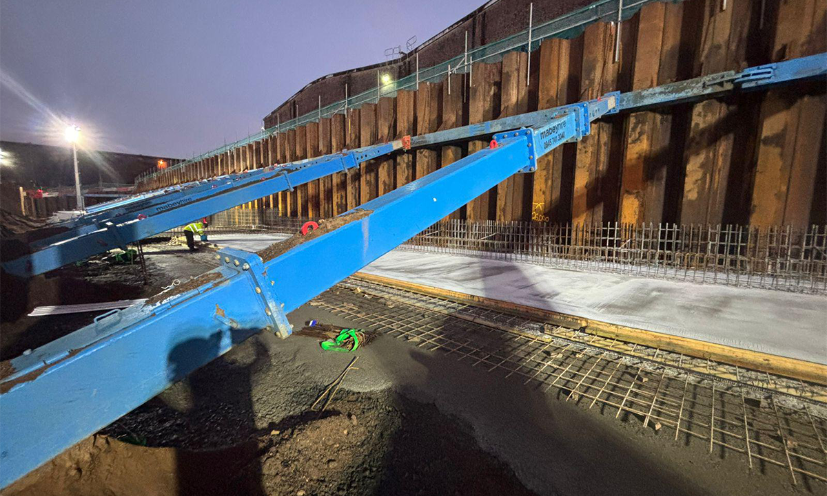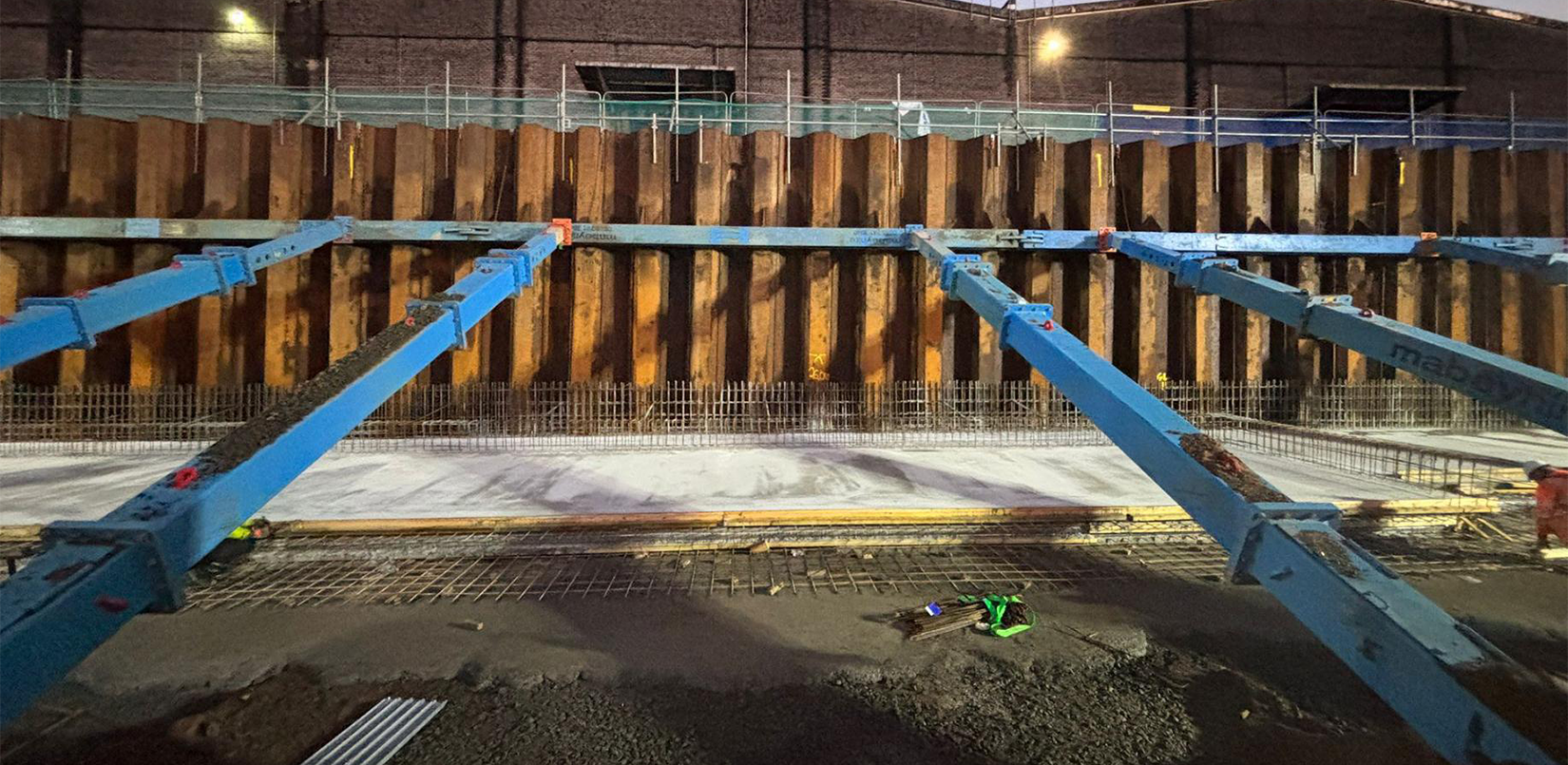 Super Bracing Struts and the hydraulic Super Shaftbrace formed the core of the temporary system, which was designed, supplied, and delivered to site in under five weeks. The temporary works safely remained in place for 10 weeks while the permanent concrete retaining wall was built against the sheet piles, after which all temporary elements were removed following smooth, ahead-of-schedule project delivery.