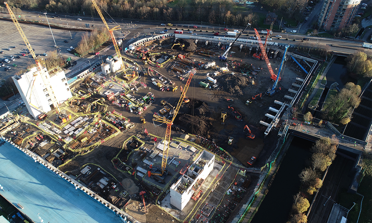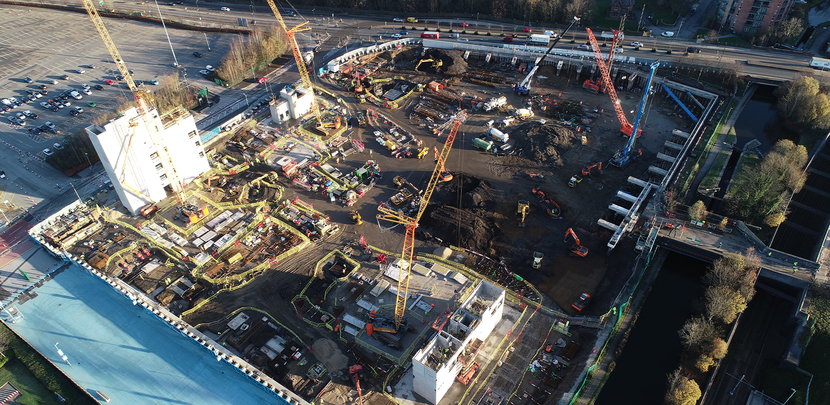 Mabey Hire provided a comprehensive temporary works solution for the challenging Manchester site, supplying trench shields, cofferdams, and customised sheet-piling to safely retain the perimeter of the four- to ten-metre-deep excavation.