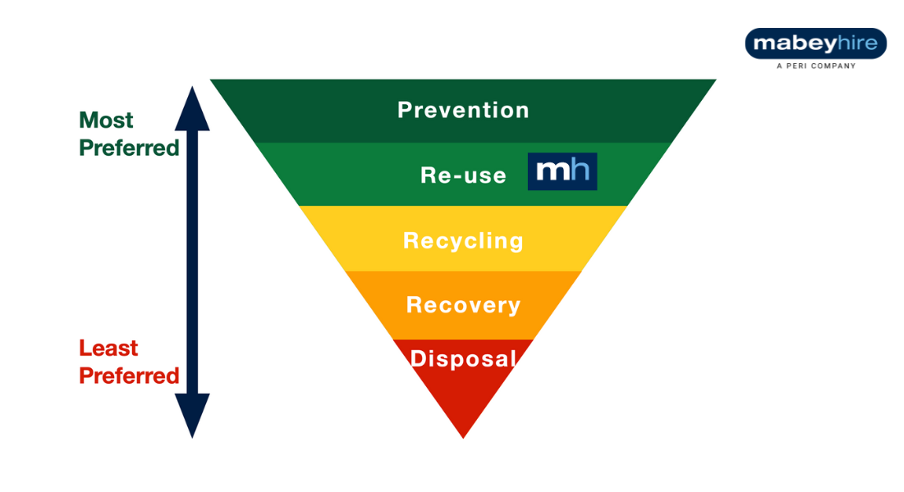 The only option in the waste hierarchy better than re-using equipment is Prevention – to not do anything at all. However, in most cases for temporary works, that wouldn’t be a good option either. Often it would mean more permanent works (so more carbon overall) or less efficient works on site (eg for an excavation this would mean more benching, more plant, more excavated soil, etc)
