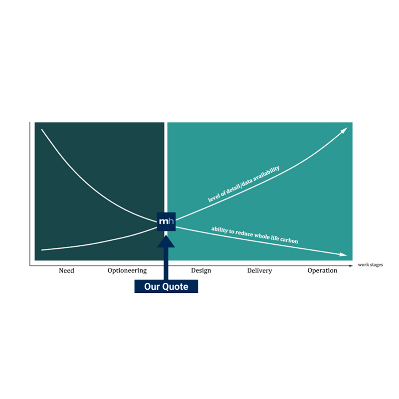 • The sweet spot for action? As the below image from PAS 2080 shows, during optioneering and design – that’s why we show embodied carbon on all our quotes.