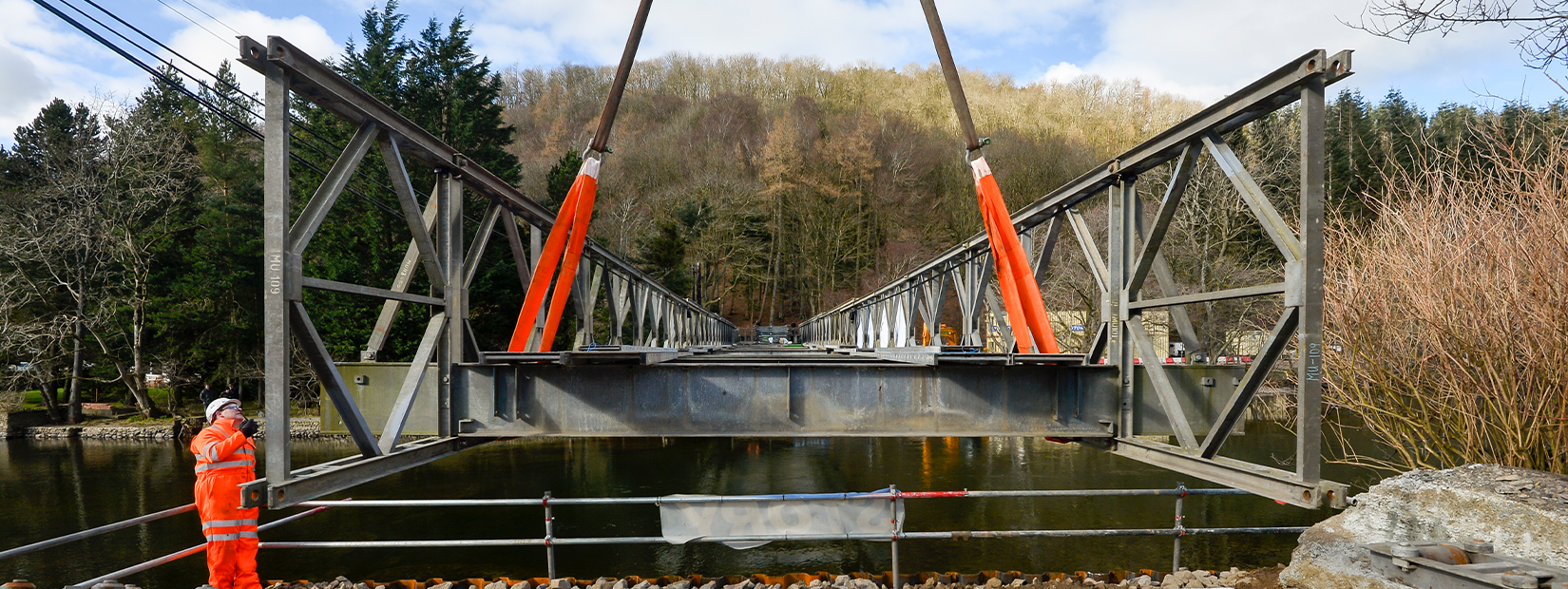 To minimise the lift weight and therefore crane size and cost, the decking can be omitted and added after the skeleton bridge structure is in position.